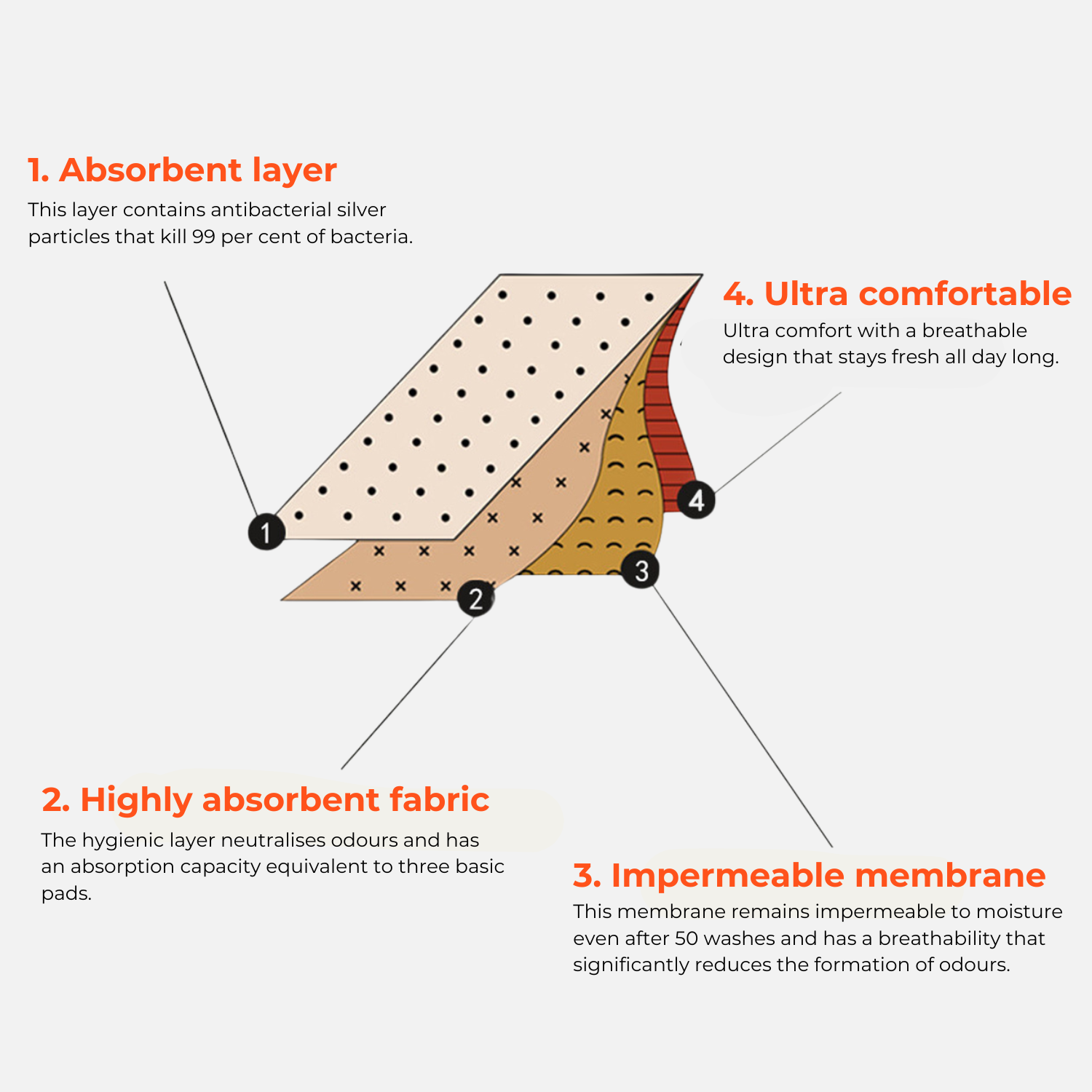 1. Absorbent layer: The quick-drying fabric absorbs all moisture for optimal comfort. This layer contains antibacterial silver particles that kill 99 per cent of bacteria.